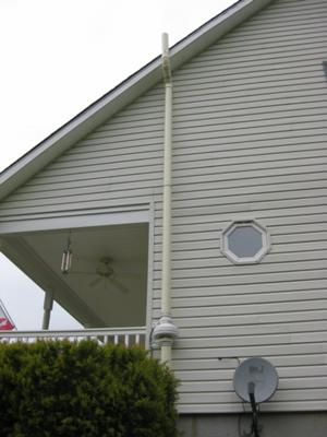 I ordered the parts from Val and went to work. I painted the vertical pipes to match the siding. I located and tied into existing daylight drain,installed Dranjer check valve at end of daylight drain. Needing another pair of hands I enlisted the help of a neighbor. We ran schedule 40 pipe up to roof, installed the pump, ran electric, installed Pro Series 3 monitor and tested system.